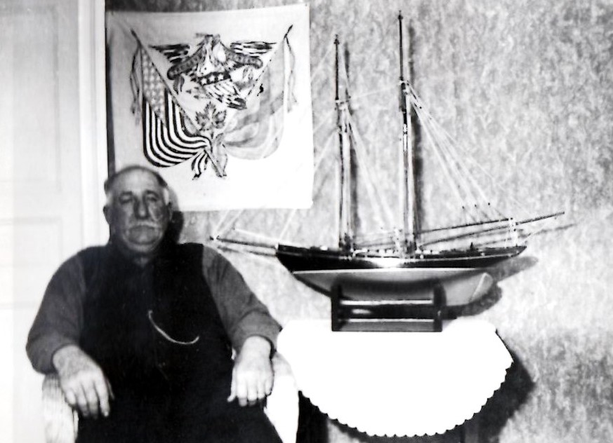 Oskar Kjellberg bredvid en modell av Bostons lotskutter