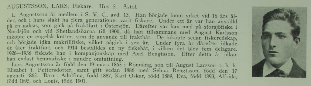 Fiskaren Lars Augustsson ”SelmasLars” (1865-1950) med hustrun Selma Natalia Bengtsdotter (1865-1939) (gifta 1886-10-15) med barnen Adolfina Bernhardina (1887-1978), Eva Benedikta (1893-1979), Alfrida Magdalena (1895-1968), Louis Sigfrid (1901-1977) samt Karl Oskar (1889-1957) med sin hustru Anna Kristina Andersdotter (1887-1957) (gifta 1911-12-03) och dottern Karin Signe Elisabet (1912-1984)
