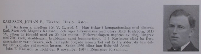 ”Vid den här tiden var det 4 båtar på Åstol som ägnade sig åt backefiske Det var förutom MD 520 Frideborg (bröderna Karlsson) , MD 74 Argo (KålleMatts och Albert Strandberg), MD 5 Brill (August Karlsa och Birger), MD 480 Karola ( Johan Kristensson och LeonardsBernhard). Båtarna gav sig av tidigt på morgonen och satte backorna utanför Hamneskär. Efter några timmar drog de upp dem och sedan på hemvägen fick de rensa fisken som mest bestod av kolja och en del torsk och lägga i backar. När de kom hem kom ett helt gäng, främst kvinnor för att hjälpa dem splitta backorna och sätta nytt agn på dem. För Frideborgs och brödernaKarlssons del var det i Ängnestöva detta jobb utfördes. Det var 10 traww med 6-7 hundre på varje som skulle ängnas. De hade placerat ut tre bänkar, en vid varje fönster och vid varje satt det tre personer. Mitt i rummet satt de två som skar agnet. Det var 9 personer som ängde. Förutom Sven och några andra gubbar var det ett gäng med kvinnor bl.a. Sabina, närmsta grannen till Ängnestöva. Men hon var inte ensam utan där fanns också BrittasLotta och Berta (Ejnars mor), KållePetterssons Fina samt Karlsson-brödernas syster Elvy som ibland fick ta backetrawwet med sig hem för hon skötte hushållet samtidigt. På sommaren hade de skelagn (blåmusslor) och då var det gamle Karlsson själv och en annan gubbe tillsammans med Johan och Sven som skena. På vinterhalvåret ängna de med sill som de köpte från Hottar som låg här med vad och fiska sill. KarlssonsJohan och AbramsKålle var de som skar silla och det var nätt o jämt de kunde hinna med att hålla de andra. En av de frackaste på att ängna var Sabina. När jag var där och ängde så hade jag bara kommit halvvägs när Sabina var klar och då bytte hon traww med mig så vi skulle bli klara fortare och så fick jag ihop några ören extra, jag var ju bara 17 år. Sabina fick 5 öre per hundre för jobbet och så fick hon dessutom mat till sina katter. Efter att hon ängnt klart för Karlssons gick hon vidare till sin släkting MattinsKarl och fortsatte ängna backer för honom och ibland fick även Strandberg hjälp av henne. Backefisket pågick från måndag till torsdag och ibland på fredag och när de kom hem vid 2-3 tiden lämnade de fisken till Karl Ek som med sin båt Magdalena körde ner de 7-8 backarna till Göteborg varje kväll. Efter avslutat fiske skulle så backorna splittas och hängas på tork till nästa tur. Ängnestöva blev lite som en samlingsplats vid dessa tillfällen och frampå eftermiddan kom det in folk som inte deltog i arbetet utan bara satte sig och var med i pratet. Det blev mycket spex och skämt många gånger”