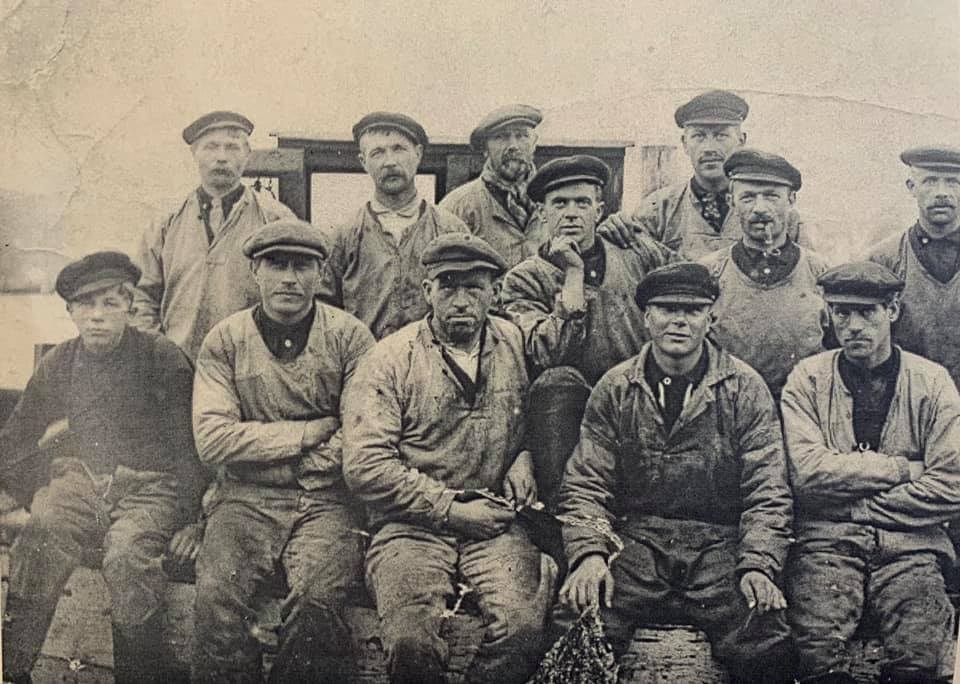 Bakre raderna fr.v. Johan Karlsson Tjörnekalv, Karl Mattsson ”MattinsKarl”, Oskar Gullbrandsson, Oskar Karlsson ”KosOskar”, Adel Kristensson Tjörnekalv, Johan Karlsson ”StavasJohan”, Oskar Hallberg, Främre raden: Ivar Andersson, Olaus Andersson, Bernhard Olsson Tjörnekalv, Karl Jackson Tjörnekalv och Karl August Pålsson. Enligt min farfar så var Karl August en baddare på att sjunga när de efter avslutad fisketur hängde upp vaden på vabocken.