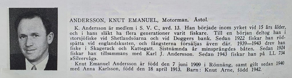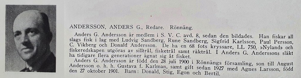 Anders ”StavasAnders” konfirmeras 1915 och får ut sitt sjömansbevis juli 1917. Han var också med Rallare på snörpvadsfiske efter sill under vintrarna. Gift 1927 med Gunlies Agnes Linnea Larsson (1901-1995) från Tjörnekalv. De bosatte sig i Rönnäng.