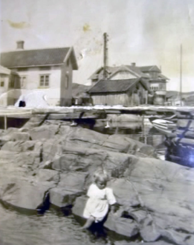 Bengt på Uddens hus. Gossen i förgrunden är Anders Johansson (f.-23) framför farfar StorLarsJohans brygga. Husen på N. Parten är Alexanders och Arturs.