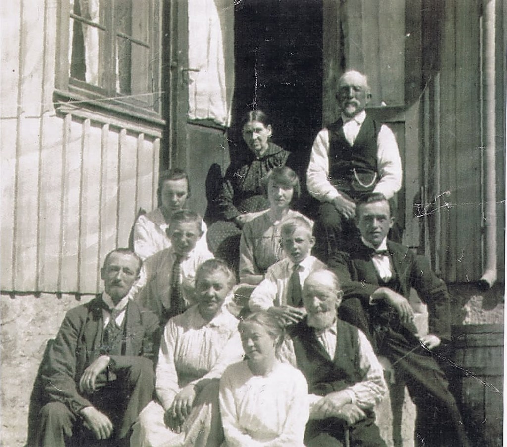 På trappan till Bengt på Uddens. Längst bak sitter Albertina och Bengt och framför dem sitter Anna, Ellen och Vilhelm. Pojkarna framför flickorna kan vara Hjalmar Beijers pojkar Erik och Anders. Längst fram sitter Hjalmar Beijer och hans fru Anna, Klara Hallberg och hennes far ”Olle på Hala”